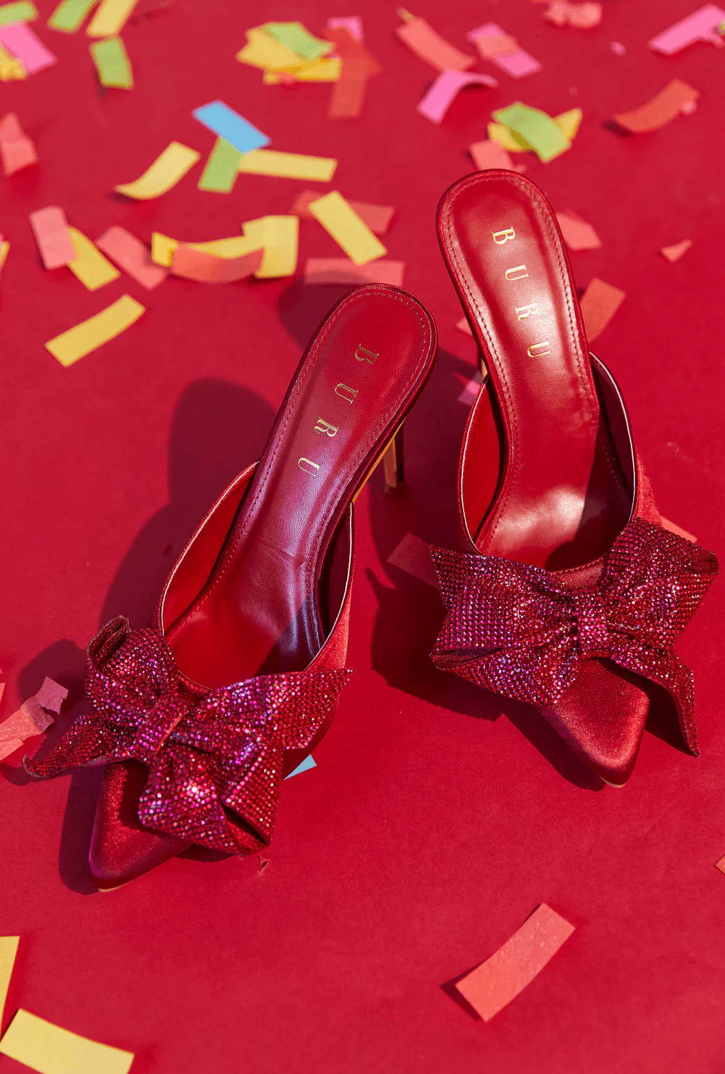 Rhinestone Bow Mules - Bordeaux Satin